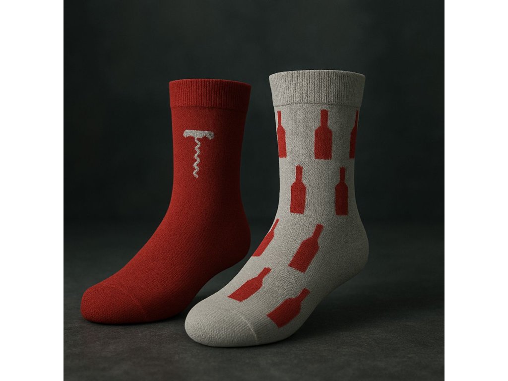 Stylový přípitek pro tvoje nohy! Jedna ponožka s vývrtkou, druhá s vínovými lahvemi – ideální kombinace pro všechny milovníky vína, relaxu a dobré nálady. Skvělé na večer s přáteli i pohodové domácí chvíle. Vyrobené z kvalitní bavlny, pro komfort, který tě nezklame.